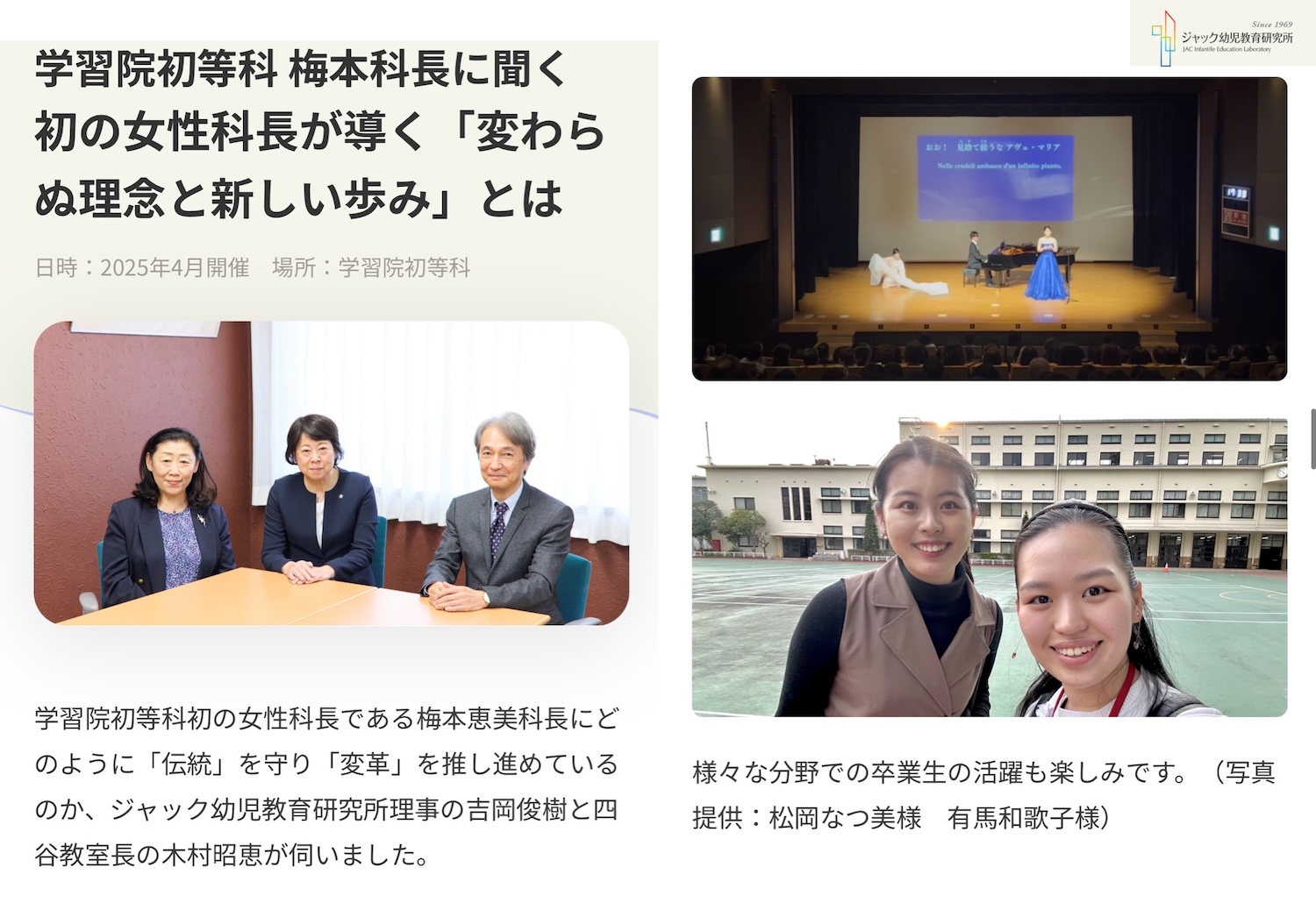 お世話になったジャック幼児教育研究所そして母校の学習院初等科ホームページに先生方の対談記事が公開されました。
